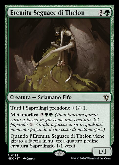 ![]() Variations— Parts— | Thelonischer Einsiedler1 / 1 Alle Saprolinge erhalten +1/+1. Morph Wenn der Thelonische Einsiedler aufgedeckt wird, erzeuge vier 1/1 grüne Saproling-Kreaturenspielsteine.