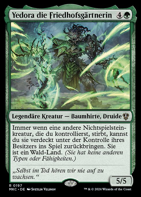 ![]() Variations— Parts— | Yedora, Grave Gardener5 / 5 Whenever another nontoken creature you control dies, you may return it to the battlefield face down under its owner's control. It's a Forest land. (It has no other types or abilities.)