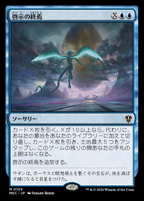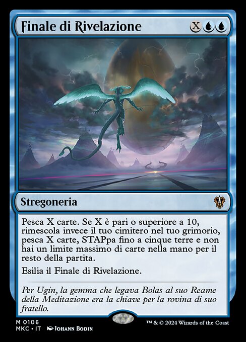 ![]() Variations— Parts— | Finale di RivelazionePesca X carte. Se X è pari o superiore a 10, rimescola invece il tuo cimitero nel tuo grimorio, pesca X carte, STAPpa fino a cinque terre e non hai un limite massimo di carte nella mano per il resto della partita. Esilia il Finale di Rivelazione.