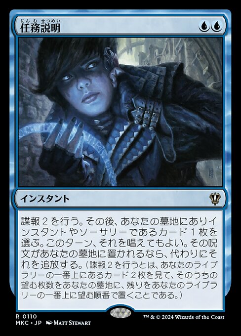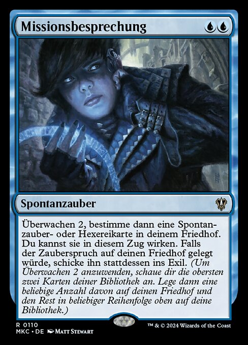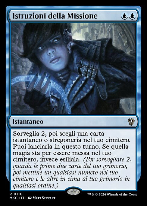 ![]() Variations— Parts— | Istruzioni della MissioneSorveglia 2, poi scegli una carta istantaneo o stregoneria nel tuo cimitero. Puoi lanciarla in questo turno. Se quella magia sta per essere messa nel tuo cimitero, invece esiliala. (Per sorvegliare 2, guarda le prime due carte del tuo grimorio, poi mettine un qualsiasi numero nel tuo cimitero e le altre in cima al tuo grimorio in qualsiasi ordine.)