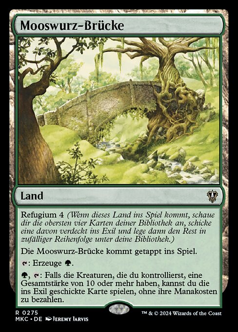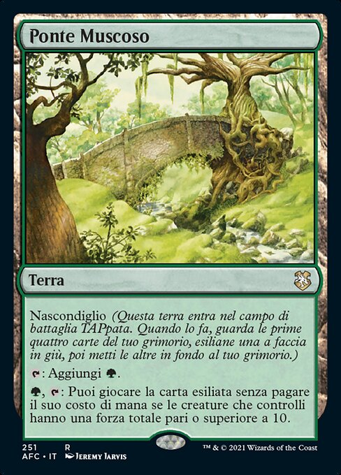 |  Variations— Parts— | Ponte MuscosoNascondiglio 4 (Quando questa terra entra nel campo di battaglia, guarda le prime quattro carte del tuo grimorio, esiliane una a faccia in giù, poi metti le altre in fondo in ordine casuale.) Il Ponte Muscoso entra nel campo di battaglia TAPpato.