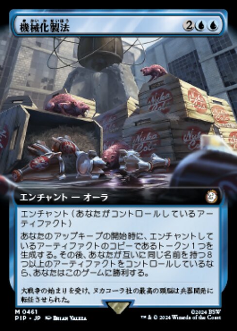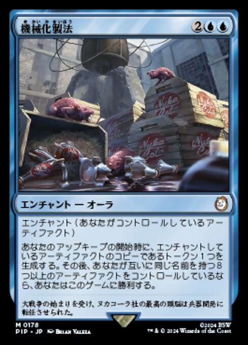 ![]() Variations— Parts— | 機械化製法エンチャント(あなたがコントロールしているアーティファクト) あなたのアップキープの開始時に、エンチャントしているアーティファクトのコピーであるトークン1つを生成する。その後、あなたが互いに同じ名前を持つ8つ以上のアーティファクトをコントロールしているなら、あなたはこのゲームに勝利する。