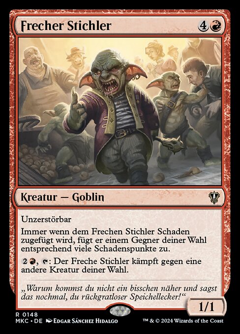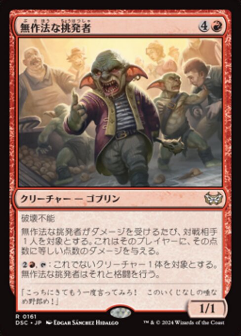 ![]() Variations— Parts— | 無作法な挑発者1 / 1 破壊不能 無作法な挑発者がダメージを受けるたび、対戦相手1人を対象とする。これはそのプレイヤーに、その点数に等しい点数のダメージを与える。