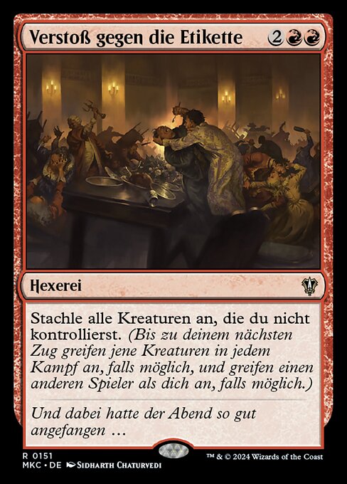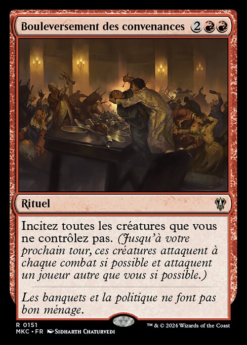 ![]() Variations— Parts— | 礼儀妨害あなたがコントロールしていないすべてのクリーチャーを使嗾する。(次のあなたのターンまで、それらのクリーチャーは、各戦闘で可能なら攻撃し、可能ならあなたでないプレイヤーを攻撃する。)