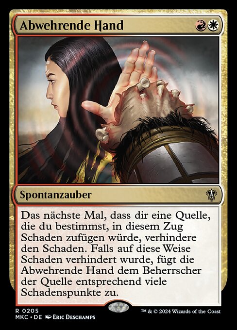 ![]() Variations— Parts— | 跳ね返す掌このターン、あなたが選んだ発生源1つが次にあなたに与えるダメージを軽減する。これによりダメージが軽減されたなら、跳ね返す掌はその発生源のコントローラーに同じ点数のダメージを与える。