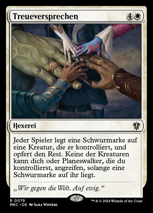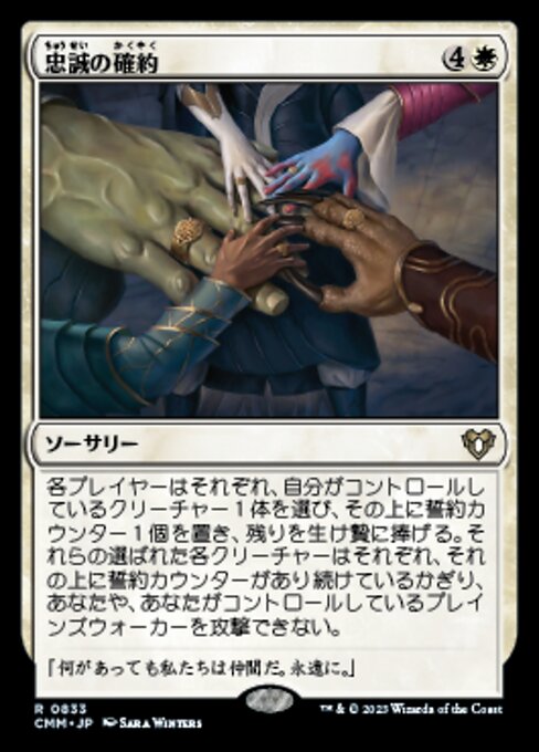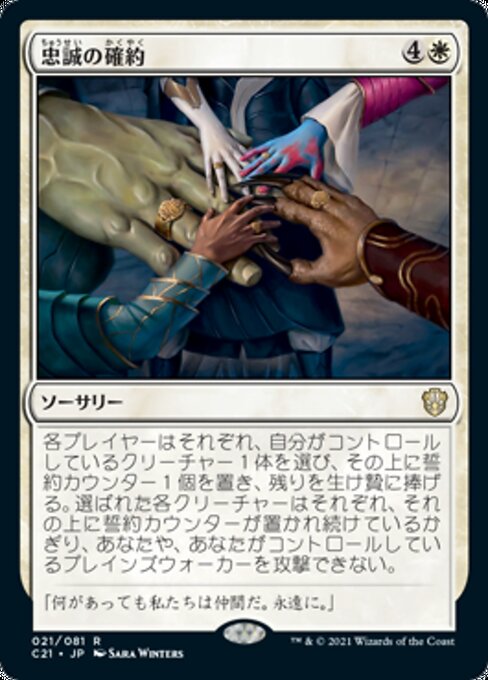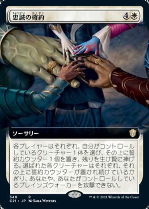 ![]() Variations— Parts— | 忠誠の確約各プレイヤーはそれぞれ、自分がコントロールしているクリーチャー1体を選び、その上に誓約カウンター1個を置き、残りを生け贄に捧げる。それらの選ばれた各クリーチャーはそれぞれ、それの上に誓約カウンターがあり続けているかぎり、あなたや、あなたがコントロールしているプレインズウォーカーを攻撃できない。