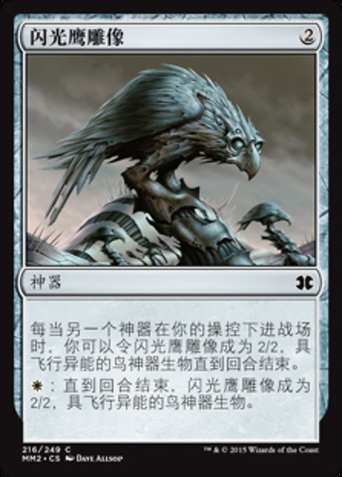 |  Variations— Parts— | 闪光鹰雕像每当另一个神器在你的操控下进战场时,你可以令闪光鹰雕像成为2/2,具飞行异能的鸟神器生物直到回合结束。