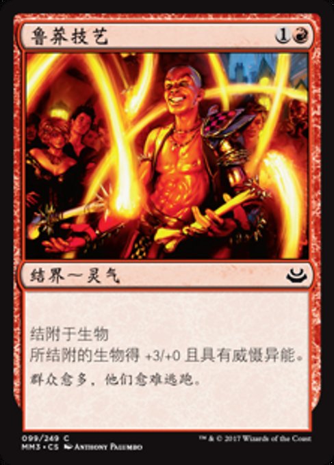 ![]() Variations— Parts— | 向こう見ずな技術エンチャント(クリーチャー) エンチャントされているクリーチャーは、+3/+0の修整を受けるとともに威迫を持つ。