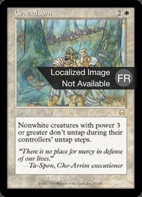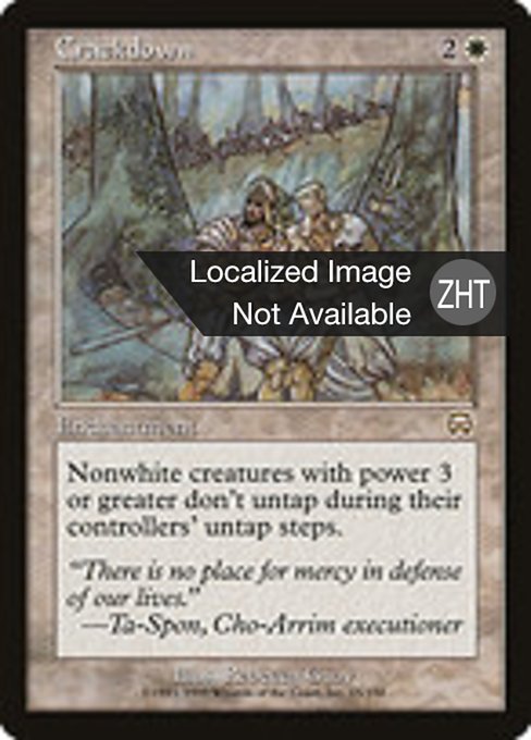 ![]() Variations— Parts— | CrackdownNonwhite creatures with power 3 or greater don't untap during their controllers' untap steps.