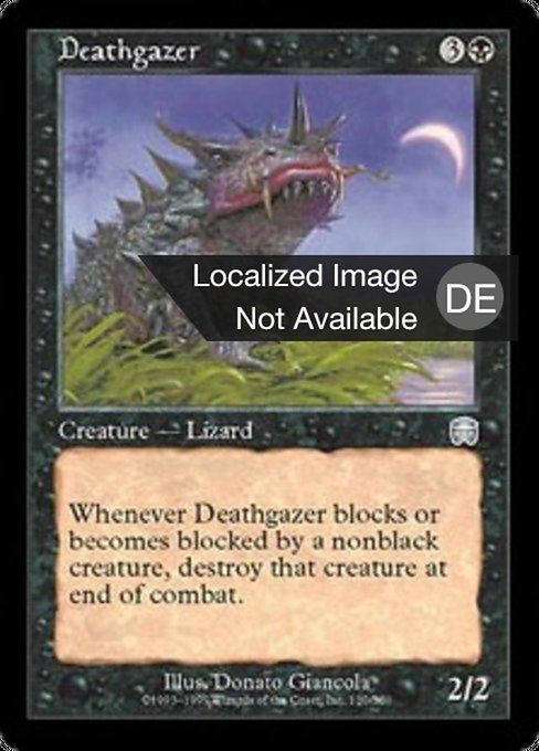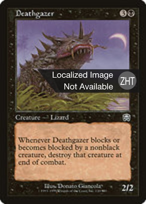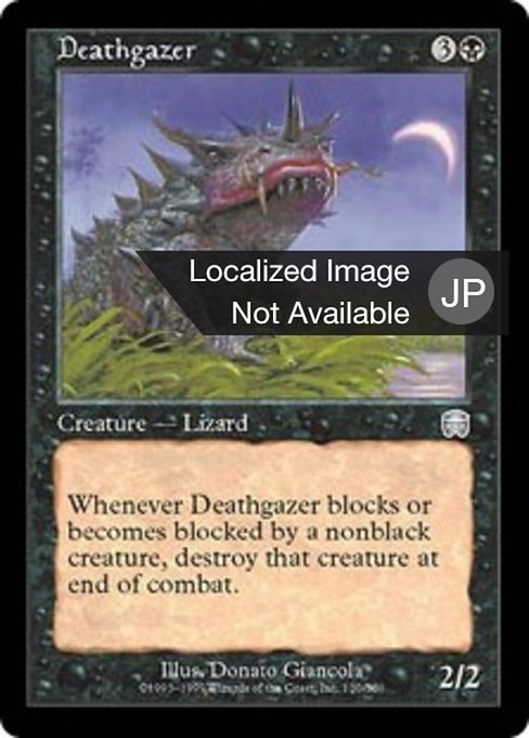 ![]() Variations— Parts— | 凶眼のトカゲ2 / 2 Whenever this creature blocks or becomes blocked by a nonblack creature, destroy that creature at end of combat.
