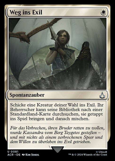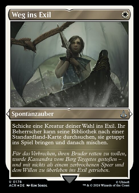 ![]() Variations— Parts— | Weg ins ExilSchicke eine Kreatur deiner Wahl ins Exil. Ihr Beherrscher kann seine Bibliothek nach einer Standardland-Karte durchsuchen, sie getappt ins Spiel bringen und danach mischen.