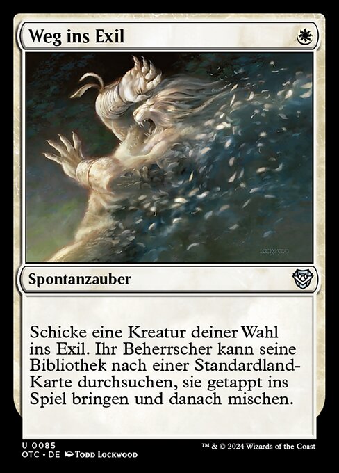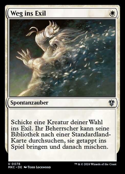 |  Variations— Parts— | Weg ins ExilSchicke eine Kreatur deiner Wahl ins Exil. Ihr Beherrscher kann seine Bibliothek nach einer Standardland-Karte durchsuchen, sie getappt ins Spiel bringen und danach mischen.