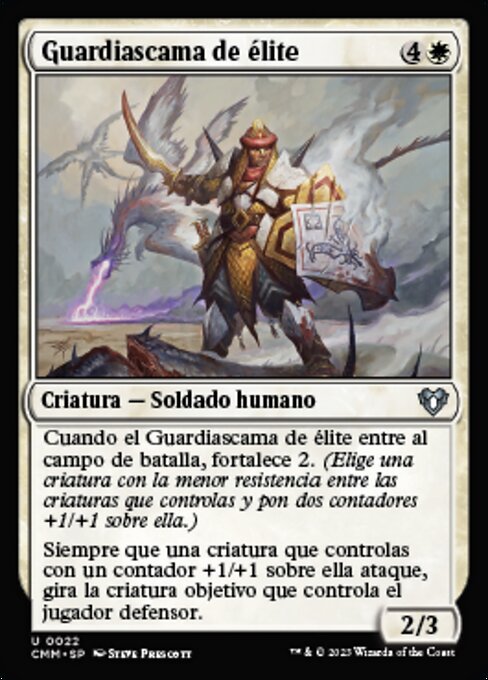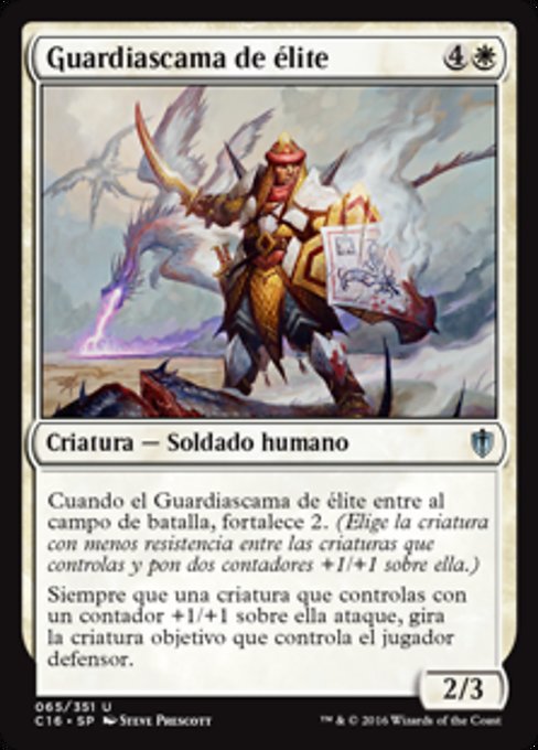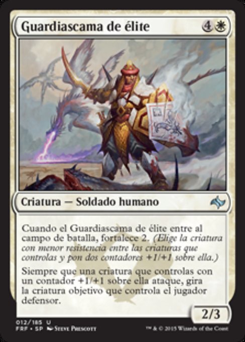 ![]() Variations— Parts— | Guardiascama de élite2 / 3 Cuando el Guardiascama de élite entre al campo de batalla, fortalece 2. (Elige una criatura con la menor resistencia entre las criaturas que controlas y pon dos contadores +1/+1 sobre ella.) Siempre que una criatura que controlas con un contador +1/+1 sobre ella ataque, gira la criatura objetivo que controla el jugador defensor.