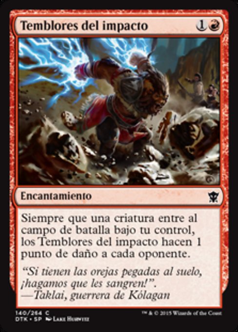 ![]() Variations— Parts— | Temblores del impactoSiempre que una criatura entre al campo de batalla bajo tu control, los Temblores del impacto hacen 1 punto de daño a cada oponente.