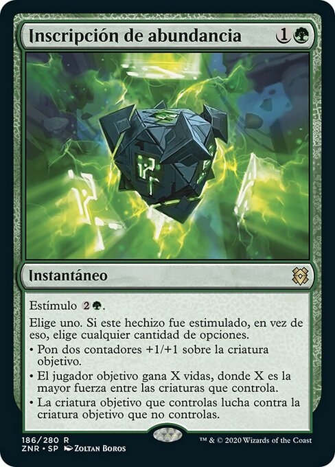|  Variations— Parts— | Inscripción de abundanciaEstímulo  Elige uno. Si este hechizo fue estimulado, en vez de eso, elige cualquier cantidad de opciones. • Pon dos contadores +1/+1 sobre la criatura objetivo. • El jugador objetivo gana X vidas, donde X es la mayor fuerza entre las criaturas que controla. • La criatura objetivo que controlas lucha contra la criatura objetivo que no controlas.