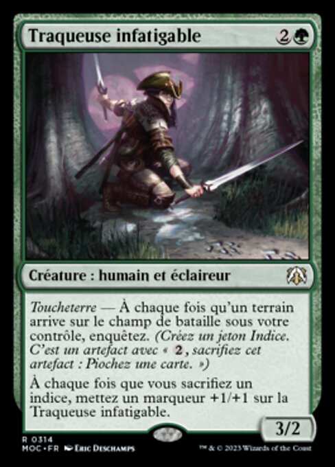 ![]() Variations— Parts— | Rastreadora incansable3 / 2 Aterrizaje — Siempre que una tierra entre al campo de batalla bajo tu control, investiga. (Crea una ficha de Pista. Es un artefacto con " Siempre que sacrifiques una Pista, pon un contador +1/+1 sobre la Rastreadora incansable.