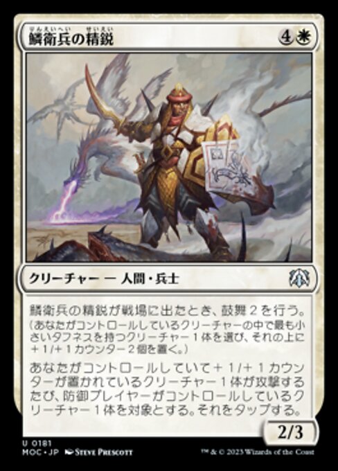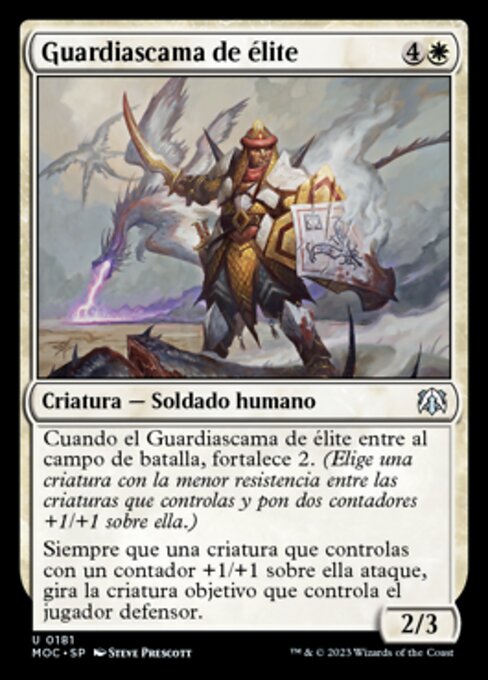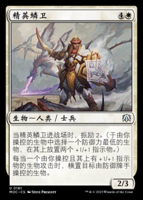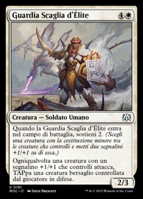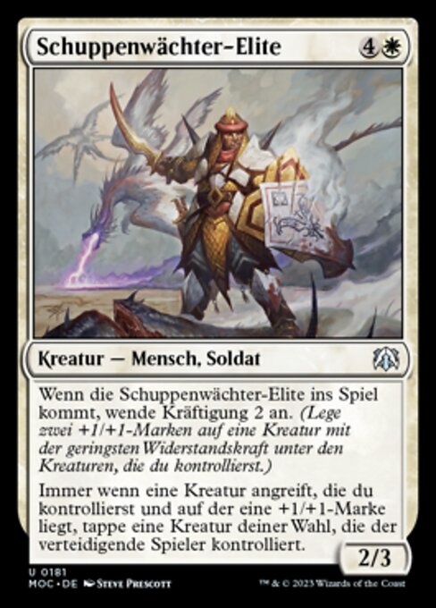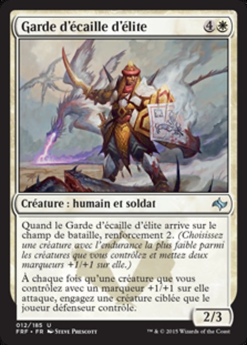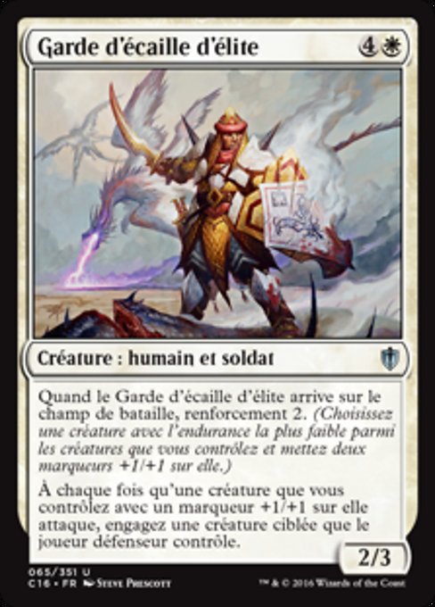 ![]() Variations— Parts— | Garde d'écaille d'élite2 / 3 Quand le Garde d'écaille d'élite arrive sur le champ de bataille, renforcement 2. (Choisissez une créature avec l'endurance la plus faible parmi les créatures que vous contrôlez et mettez deux marqueurs +1/+1 sur elle.) À chaque fois qu'une créature que vous contrôlez avec un marqueur +1/+1 sur elle attaque, engagez une créature ciblée que le joueur défenseur contrôle.
