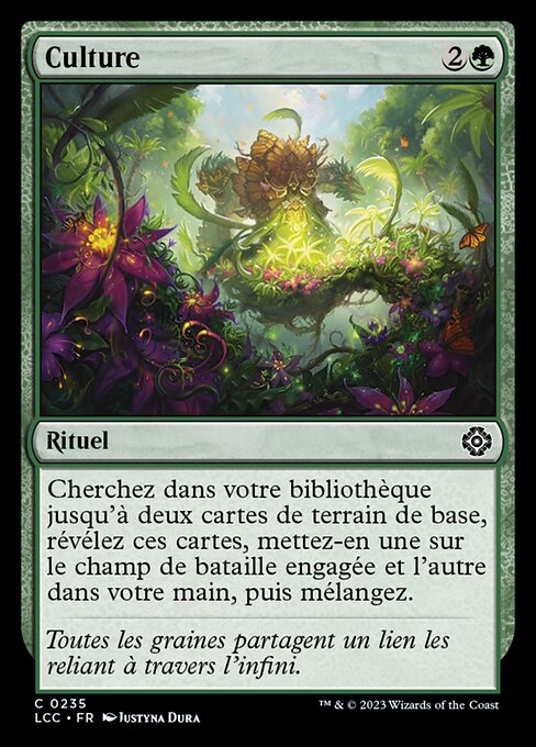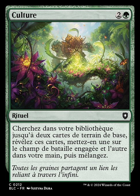 |  Variations— Parts— | CultureCherchez dans votre bibliothèque jusqu'à deux cartes de terrain de base, révélez ces cartes, mettez-en une sur le champ de bataille engagée et l'autre dans votre main, puis mélangez.