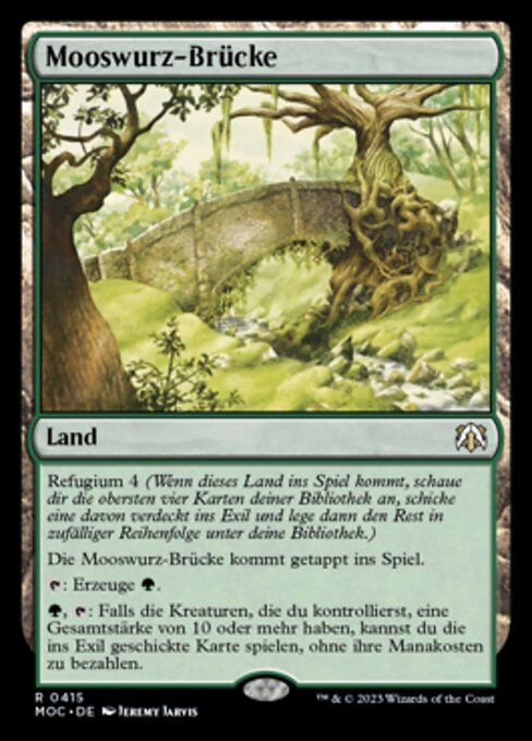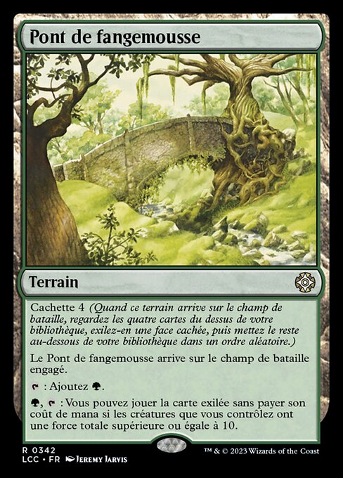 |  Variations— Parts— | Pont de fangemousseCachette 4 (Quand ce terrain arrive sur le champ de bataille, regardez les quatre cartes du dessus de votre bibliothèque, exilez-en une face cachée, puis mettez le reste au-dessous de votre bibliothèque dans un ordre aléatoire.) Le Pont de fangemousse arrive sur le champ de bataille engagé.