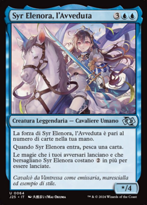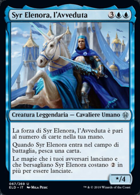 ![]() Variations— Parts— | Syr Elenora, l'Avveduta* / 4 La forza di Syr Elenora, l'Avveduta è pari al numero di carte nella tua mano. Quando Syr Elenora entra nel campo di battaglia, pesca una carta. Le magie che i tuoi avversari lanciano e che bersagliano Syr Elenora costano