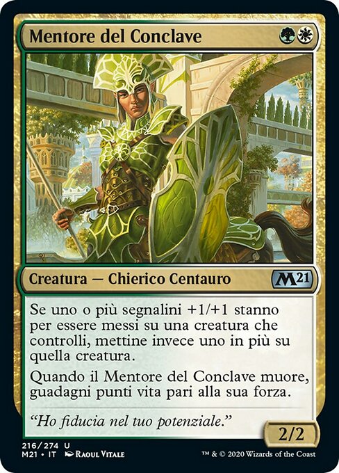 ![]() Variations— Parts— | Mentore del Conclave2 / 2 Se uno o più segnalini +1/+1 stanno per essere messi su una creatura che controlli, mettine invece uno in più su quella creatura. Quando il Mentore del Conclave muore, guadagni punti vita pari alla sua forza.