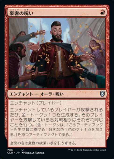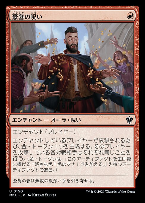 |  Variations— Parts— | 豪奢の呪いエンチャント(プレイヤー) エンチャントしているプレイヤーが攻撃されるたび、金・トークン1つを生成する。そのプレイヤーを攻撃している各対戦相手はそれぞれ同じことを行う。(金・トークンは、「このアーティファクトを生け贄に捧げる:好きな色1色のマナ1点を加える。」を持つアーティファクトである。)