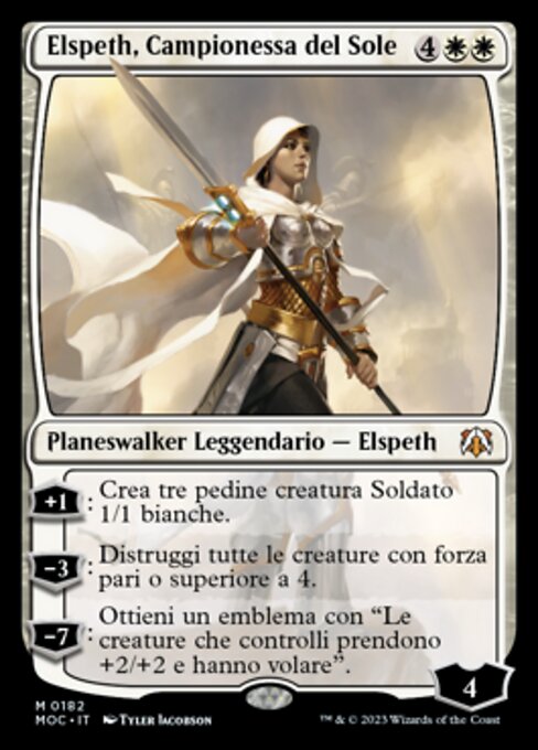 ![]() Variations— Parts— | Elspeth, Campeã do Sol+1 +1+1 Crie três fichas de criatura Soldado branca 1/1.-3 +1: Crie três fichas de criatura Soldado branca 1/1. -3+1 Crie três fichas de criatura Soldado branca 1/1.-3 Destrua todas as criaturas com poder igual ou superior a 4.-7 : Você recebe um emblema com "As criaturas que você controla recebem +2/+2 e têm voar".
