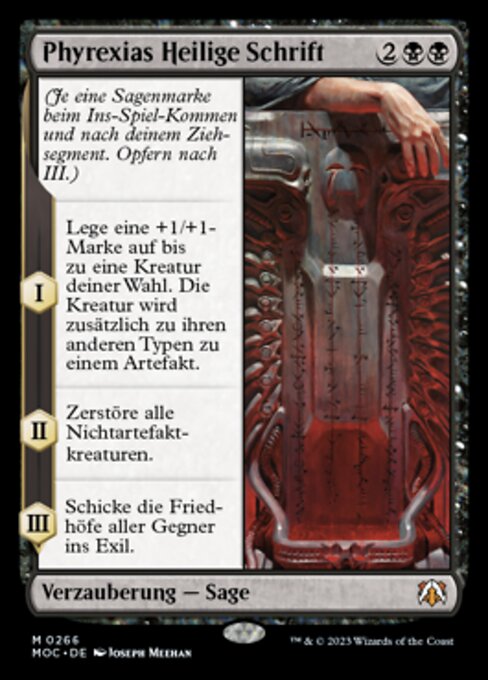 ![]() Variations— Parts— | Escrituras Phyrexianas(Conforme esta Saga entra e após sua etapa de compra, adicione um marcador de conhecimento. Sacrifique-a após III.) I — Coloque um marcador +1/+1 em até uma criatura alvo. Aquela criatura se torna um artefato além de seus outros tipos. II — Destrua todas as criaturas não artefato. III — Exile os cemitérios de todos os oponentes.
