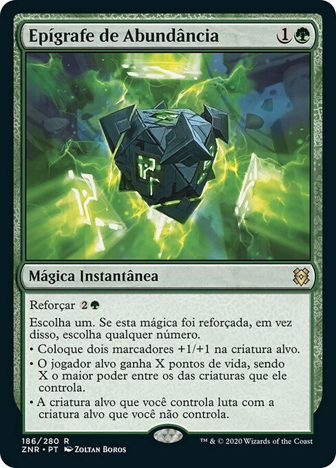 |  Variations— Parts— | Epígrafe de AbundânciaReforçar  Escolha um. Se esta mágica foi reforçada, em vez disso, escolha qualquer número. • Coloque dois marcadores +1/+1 na criatura alvo. • O jogador alvo ganha X pontos de vida, sendo X o maior poder entre os das criaturas que ele controla. • A criatura alvo que você controla luta com a criatura alvo que você não controla.