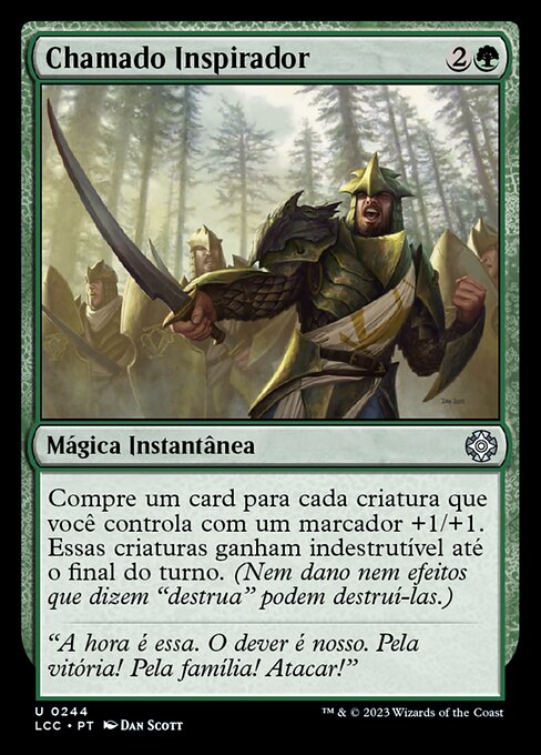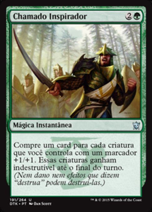 |  Variations— Parts— | Chamado InspiradorCompre um card para cada criatura que você controla com um marcador +1/+1. Essas criaturas ganham indestrutível até o final do turno.