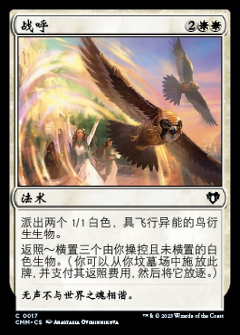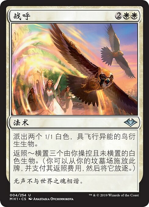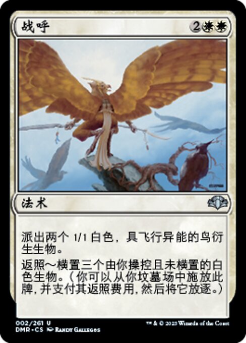 |  Variations— Parts— | 战呼派出两个1/1白色,具飞行异能的鸟衍生生物。 返照~横置三个由你操控且未横置的白色生物。(你可以从你坟墓场中施放此牌,并支付其返照费用,然后将它放逐。)