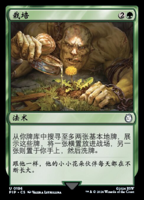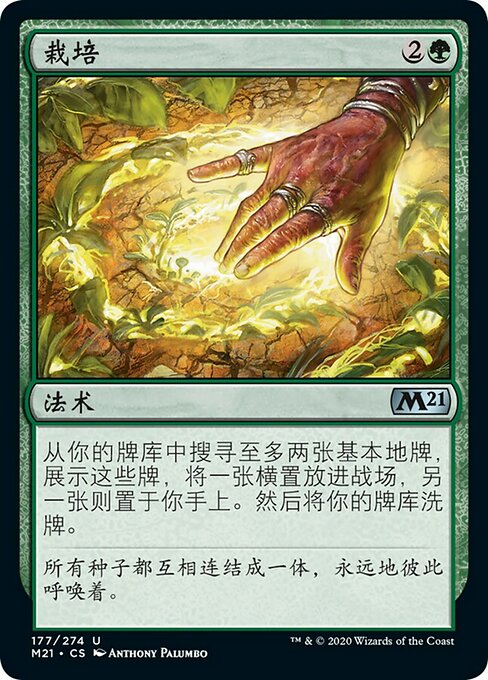 ![]() Variations— Parts— | 栽培从你牌库中搜寻至多两张基本地牌,展示这些牌,将一张横置放进战场,另一张则置于你手上,然后洗牌。