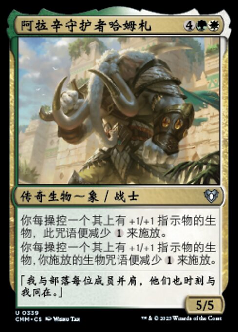 ![]() Variations— Parts— | 阿拉辛守护者哈姆札5 / 5 你每操控一个其上有+1/+1指示物的生物,此咒语便减少 你每操控一个其上有+1/+1指示物的生物,你施放的生物咒语便减少