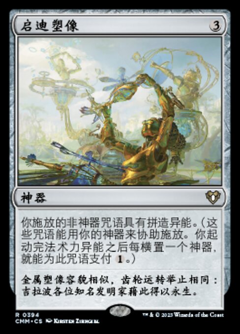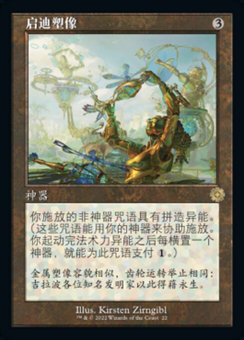 |  Variations— Parts— | 启迪塑像你施放的非神器咒语具有拼造异能。(这些咒语能用你的神器来协助施放。你起动完法术力异能之后每横置一个神器,就能为此咒语支付