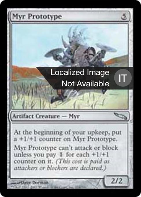|  Variations— Parts— | Myr Prototype2 / 2 At the beginning of your upkeep, put a +1/+1 counter on this creature. This creature can't attack or block unless you pay
