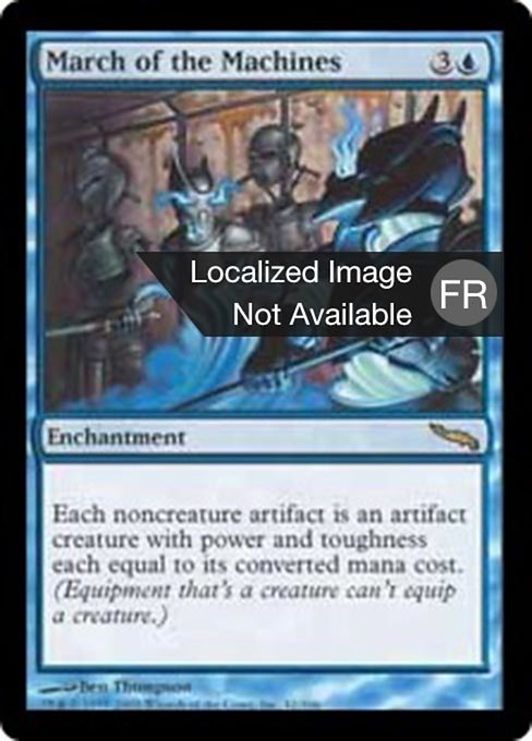 ![]() Variations— Parts—  | 機械の行進クリーチャーでない各アーティファクトは、パワーとタフネスがそれぞれ点数でみたマナ・コストに等しいアーティファクト・クリーチャーである。 (クリーチャーである装備品をクリーチャーに装備することはできない。)