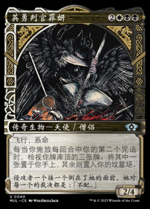 |  Variations : 3Parts— | Firja, Judge of Valor2 / 4 Flying, lifelink Whenever you cast your second spell each turn, look at the top three cards of your library. Put one of them into your hand and the rest into your graveyard.