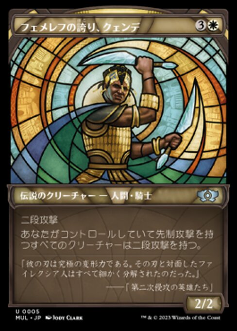 |  Variations— Parts— | Kwende, Orgoglio di Femeref2 / 2 Doppio attacco Le creature con attacco improvviso che controlli hanno doppio attacco.
