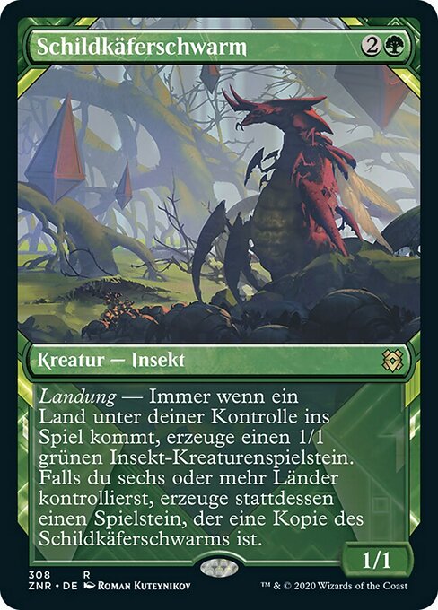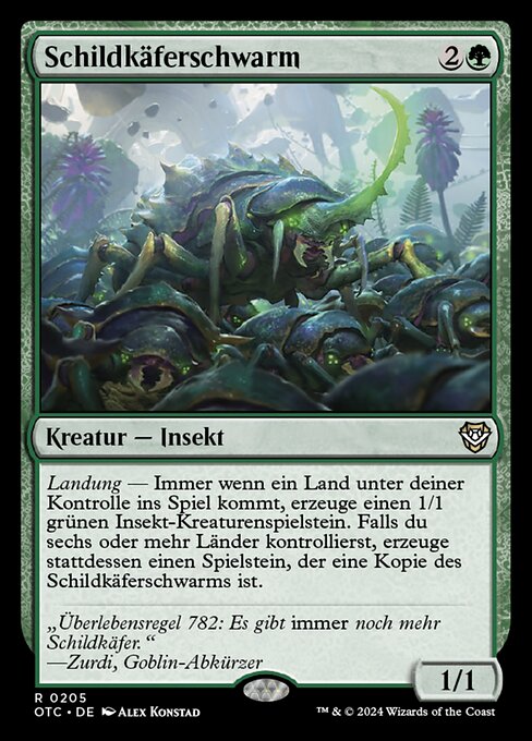 ![]() Variations— Parts— | Schildkäferschwarm1 / 1 Landung — Immer wenn ein Land unter deiner Kontrolle ins Spiel kommt, erzeuge einen 1/1 grünen Insekt-Kreaturenspielstein. Falls du sechs oder mehr Länder kontrollierst, erzeuge stattdessen einen Spielstein, der eine Kopie des Schildkäferschwarms ist.