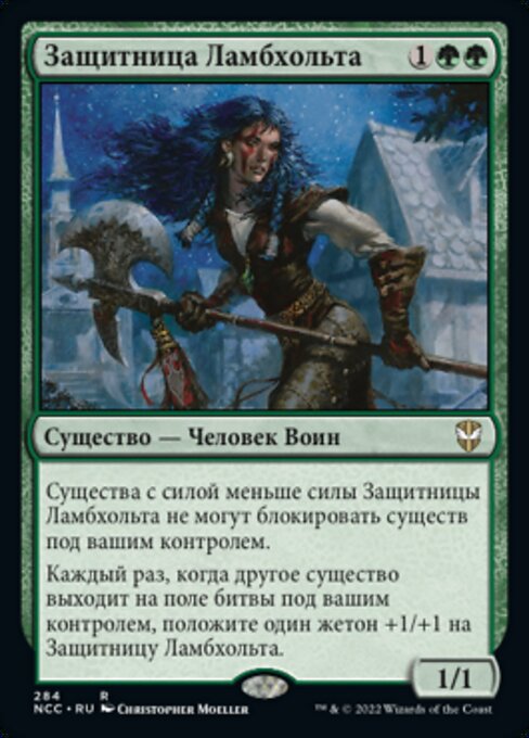 |  Variations— Parts— | Champion of Lambholt1 / 1 Creatures with power less than this creature's power can't block creatures you control. Whenever another creature you control enters, put a +1/+1 counter on this creature.
