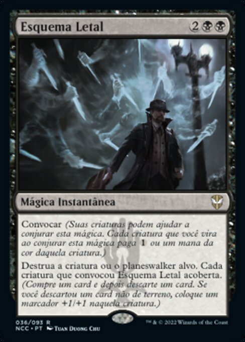 |  Variations : 1Parts— | Lethal SchemeConvoke (Your creatures can help cast this spell. Each creature you tap while casting this spell pays for  Destroy target creature or planeswalker. Each creature that convoked this spell connives. (Draw a card, then discard a card. If you discarded a nonland card, put a +1/+1 counter on that creature.)