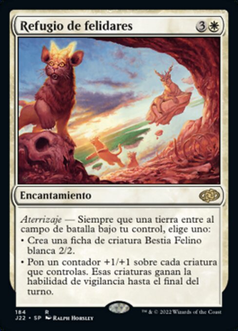 ![]() Variations— Parts— | Refugio de felidaresAterrizaje — Siempre que una tierra entre al campo de batalla bajo tu control, elige uno: • Crea una ficha de criatura Bestia Felino blanca 2/2. • Pon un contador +1/+1 sobre cada criatura que controlas. Esas criaturas ganan la habilidad de vigilancia hasta el final del turno.
