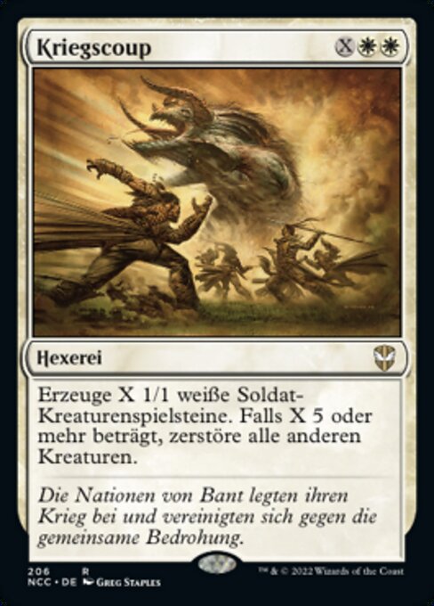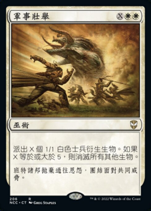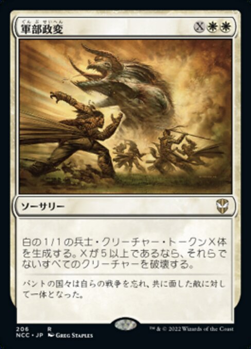 |  Variations— Parts— | Colpo MilitareCrea X pedine creatura Soldato 1/1 bianche. Se X è pari o superiore a 5, distruggi tutte le altre creature.