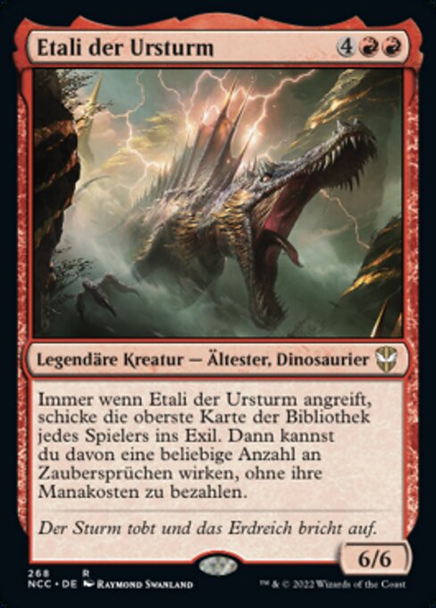 ![]() Variations— Parts— | 原初の嵐、エターリ6 / 6 原初の嵐、エターリが攻撃するたび、各プレイヤーのライブラリーの一番上にあるカード1枚をそれぞれ追放する。その後あなたは、それらのカードの中から望む数の呪文をマナ・コストを支払うことなく唱えてもよい。
