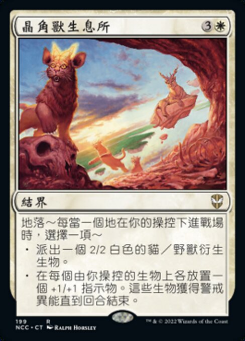 ![]() Variations— Parts— | 晶角兽生息所地落~每当一个地在你的操控下进战场时,选择一项~ •派出一个2/2白色的猫/野兽衍生生物。 •在每个由你操控的生物上各放置一个+1/+1指示物。这些生物获得警戒异能直到回合结束。