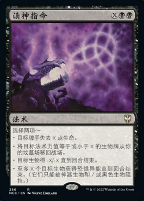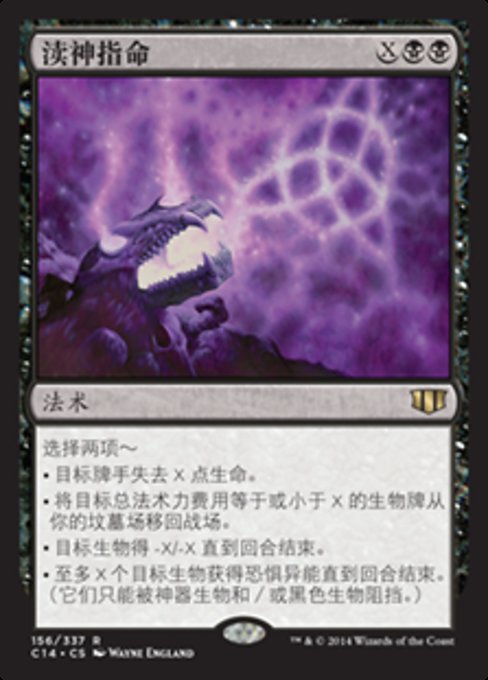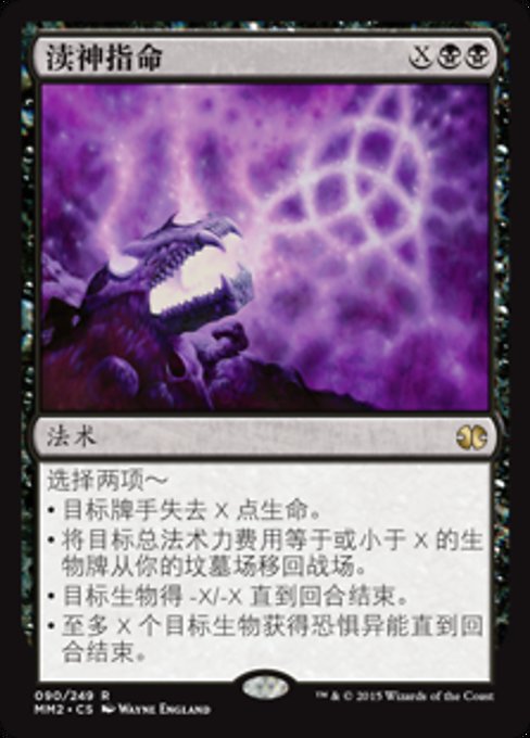 ![]() Variations— Parts— | 渎神指命选择两项~ •目标牌手失去X点生命。 •将目标法术力值等于或小于X的生物牌从你的坟墓场移回战场。 •目标生物得-X/-X直到回合结束。 •至多X个目标生物获得恐惧异能直到回合结束。(它们只能被神器生物和/或黑色生物阻挡。)
