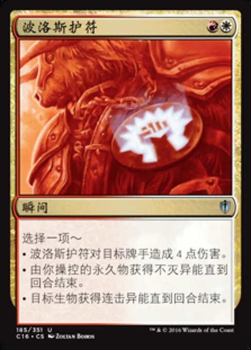 |  Variations— Parts— | 波洛斯护符选择一项~ •波洛斯护符对目标牌手或鹏洛客造成4点伤害。 •由你操控的永久物获得不灭异能直到回合结束。 •目标生物获得连击异能直到回合结束。