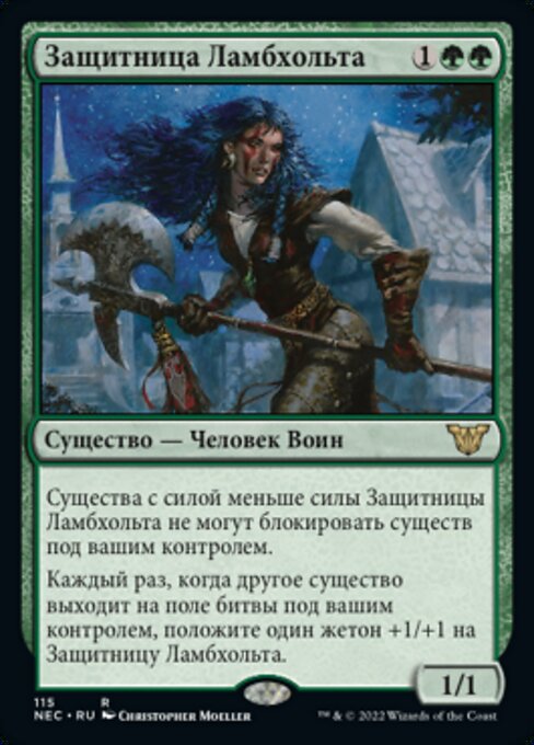 |  Variations— Parts— | Champion of Lambholt1 / 1 Creatures with power less than this creature's power can't block creatures you control. Whenever another creature you control enters, put a +1/+1 counter on this creature.