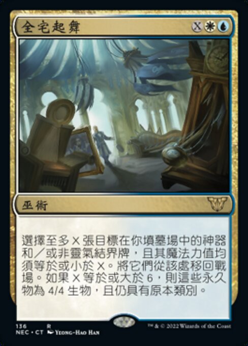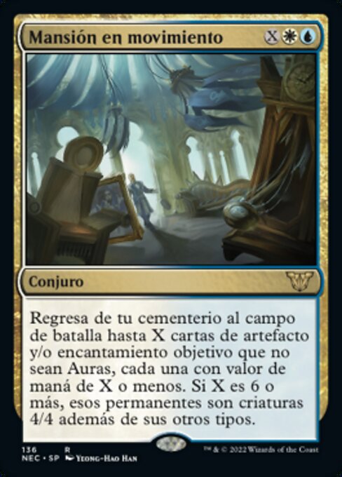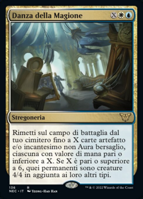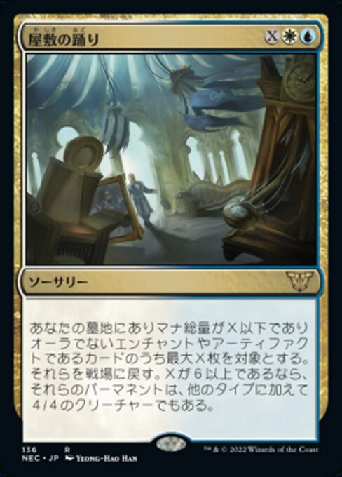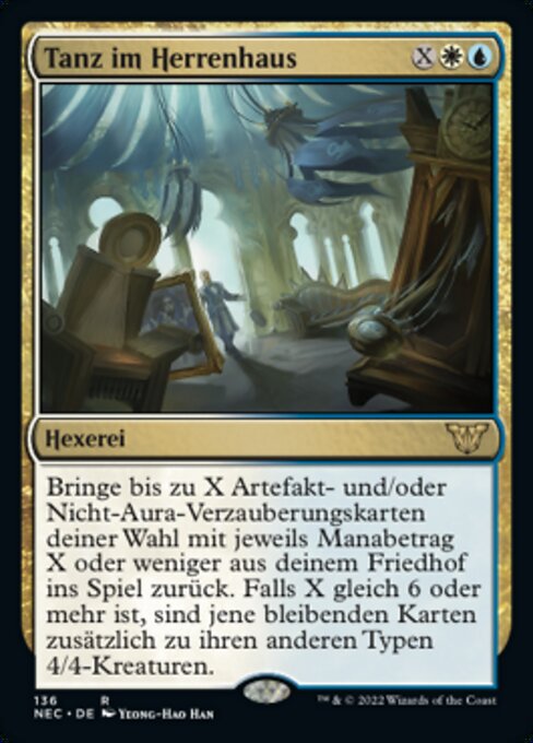 |  Variations— Parts— | Dance of the ManseReturn up to X target artifact and/or non-Aura enchantment cards each with mana value X or less from your graveyard to the battlefield. If X is 6 or more, those permanents are 4/4 creatures in addition to their other types.