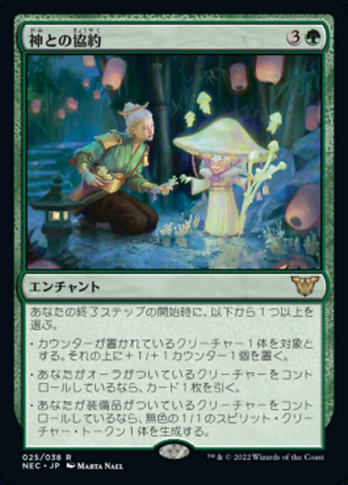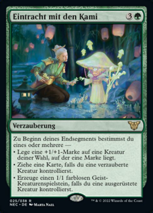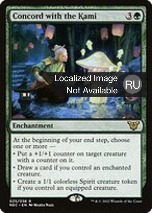 ![]() Variations : 1Parts : 2 | Concord with the KamiAt the beginning of your end step, choose one or more — • Put a +1/+1 counter on target creature with a counter on it. • Draw a card if you control an enchanted creature. • Create a 1/1 colorless Spirit creature token if you control an equipped creature.